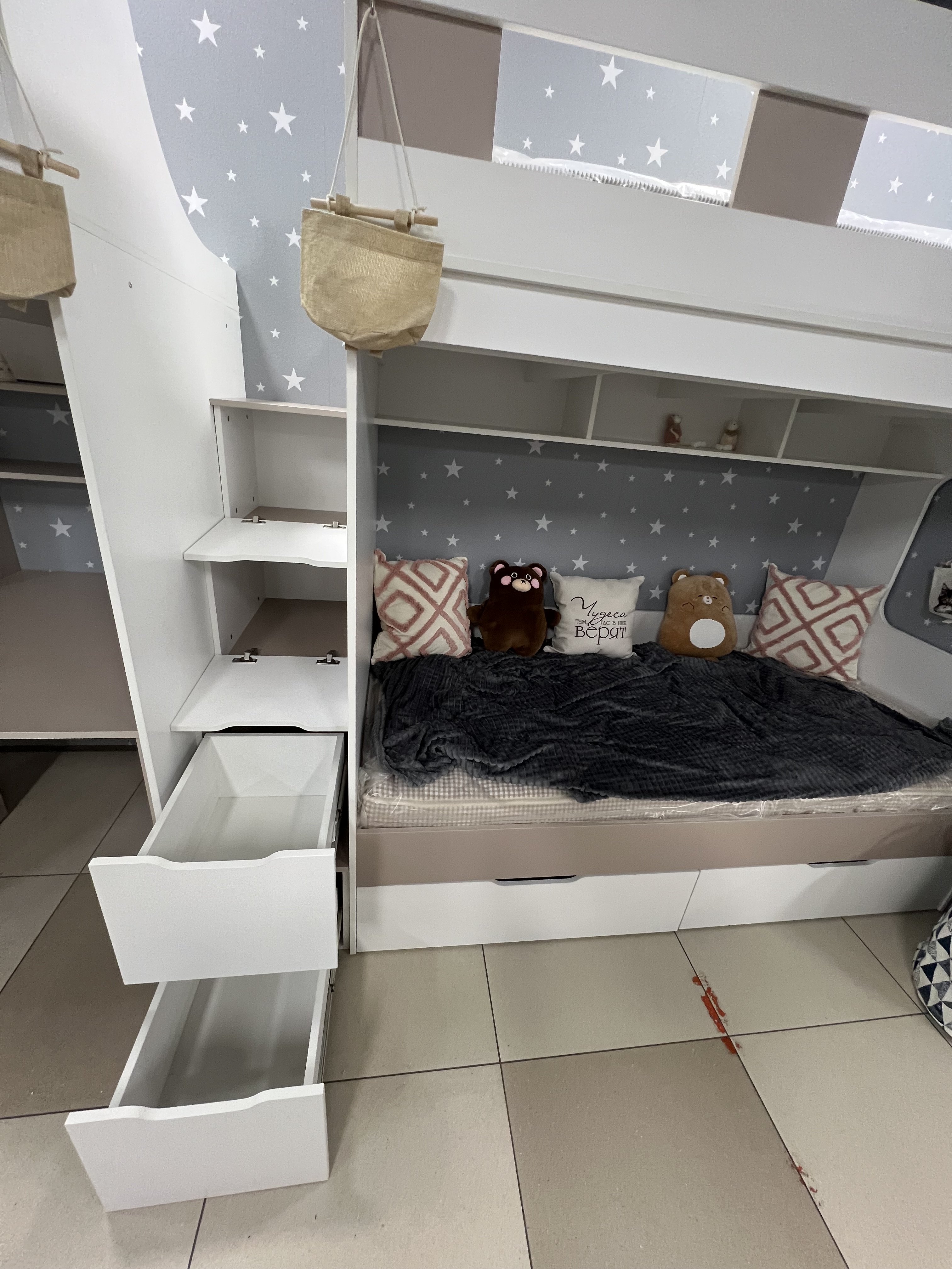 - Максимальная экономия пространства: кровать освобождает место для игр и учебы, сохраняя при этом уют и комфорт.