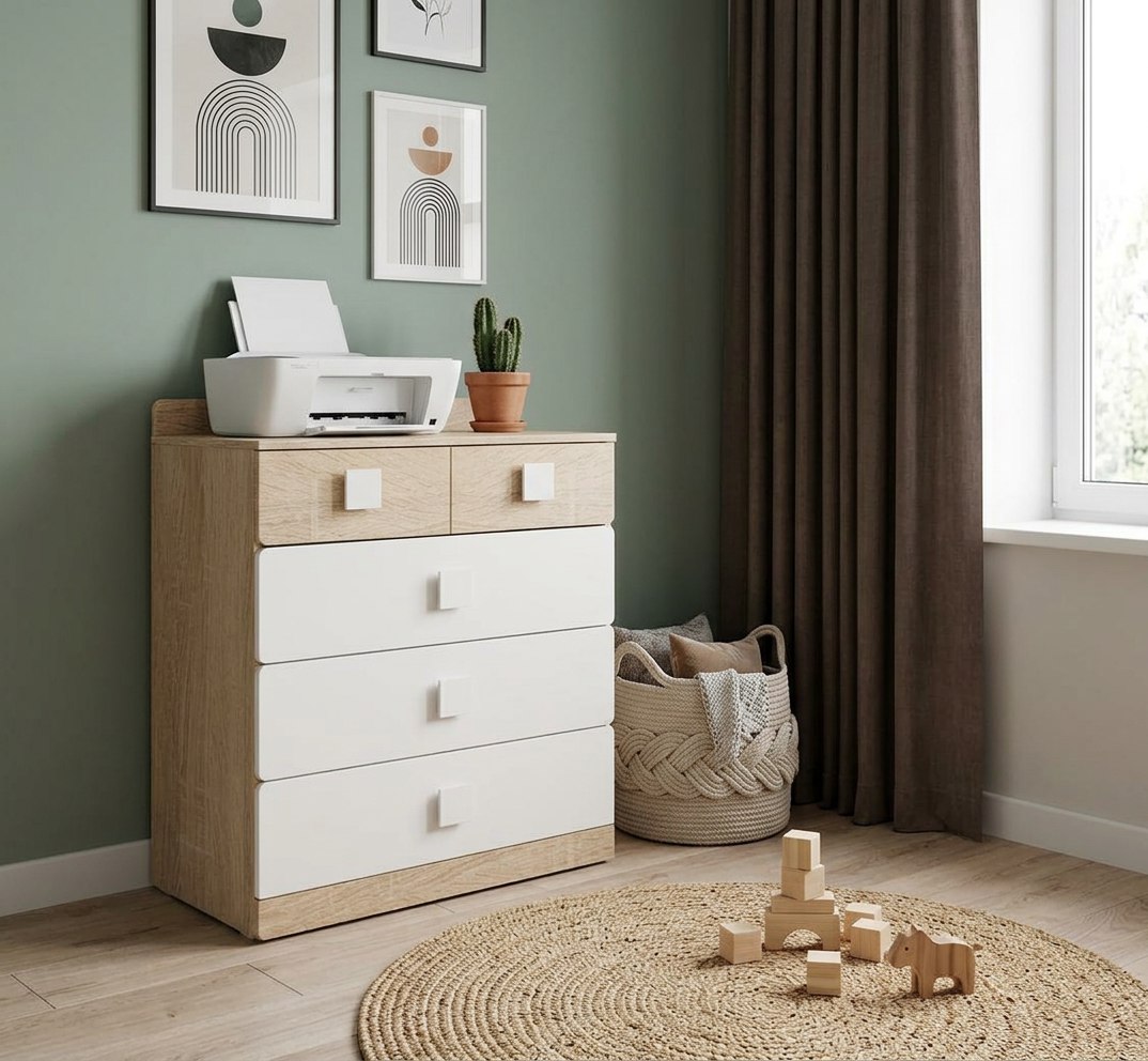Оттенок натурального дерева "дуб сонома" дает ощущение комфорта и единения с природой, а воздушный белый цвет в интерьере работает как основа для ярких штрихов.