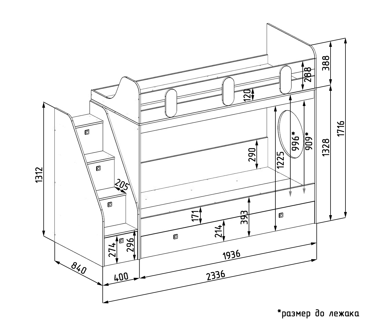 Габариты кровати с учетом лестницы: ширин 2336 х высот 1716 х глубина 840 мм