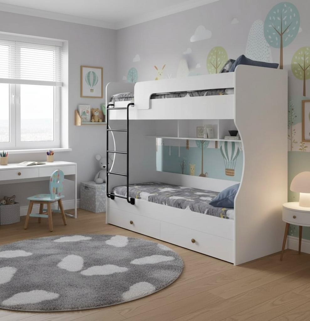 Двухъярусная кровать в белом цвете идеальна для любых интерьеров.