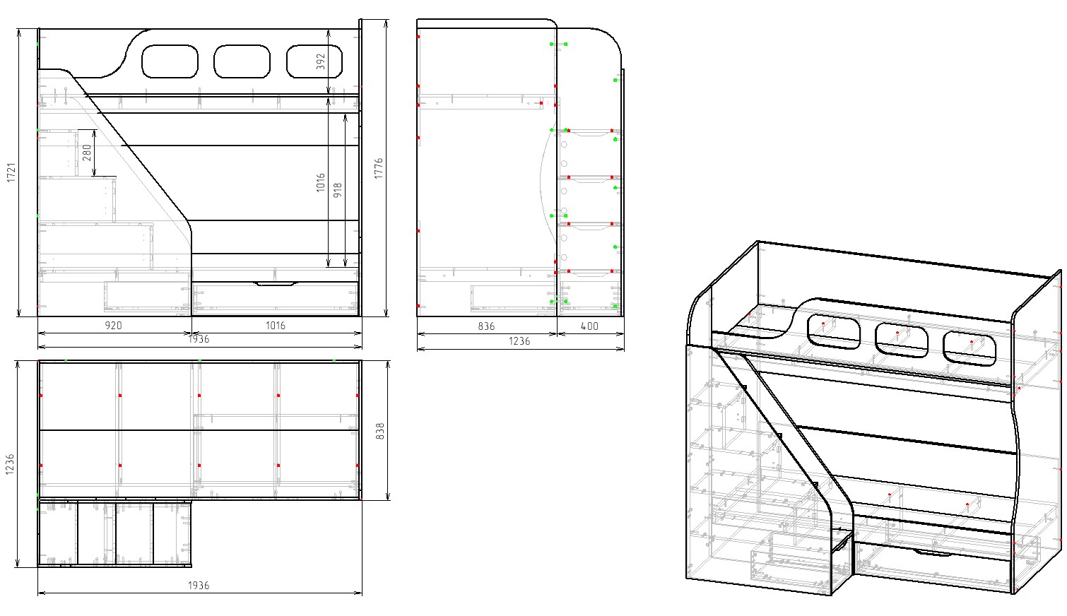 Габариты кровати: ширина 1936 х высота 1721 х глубина с учетом лестницы 1236 мм