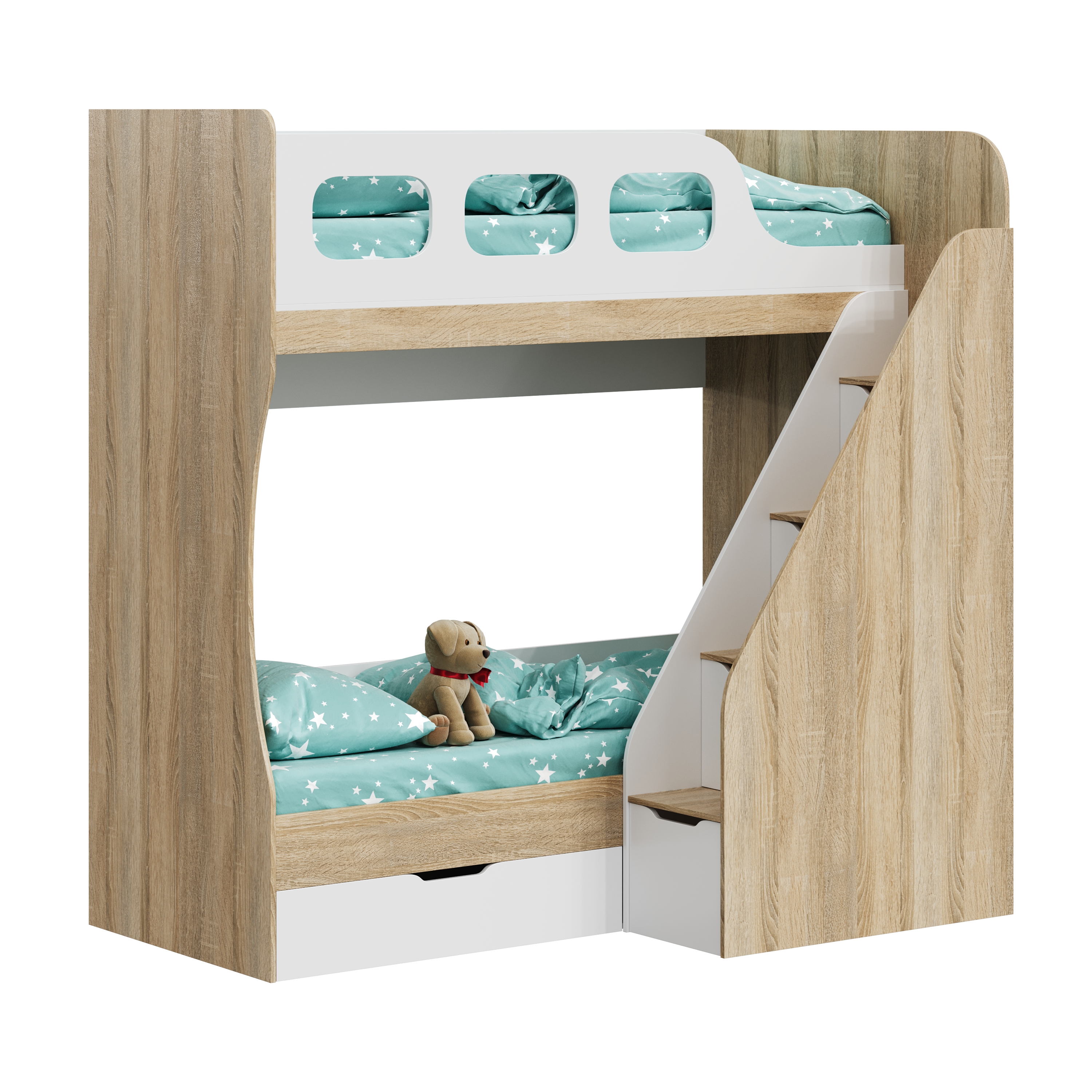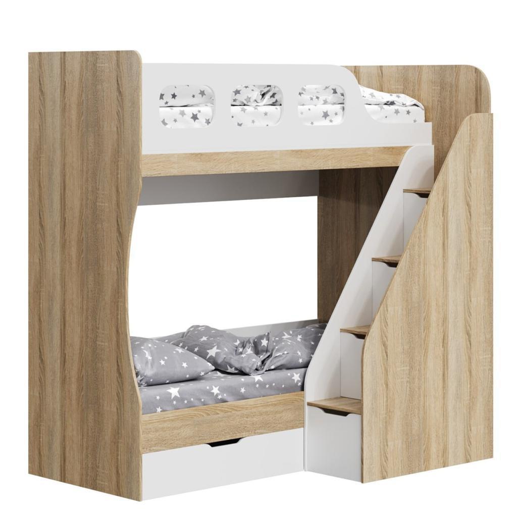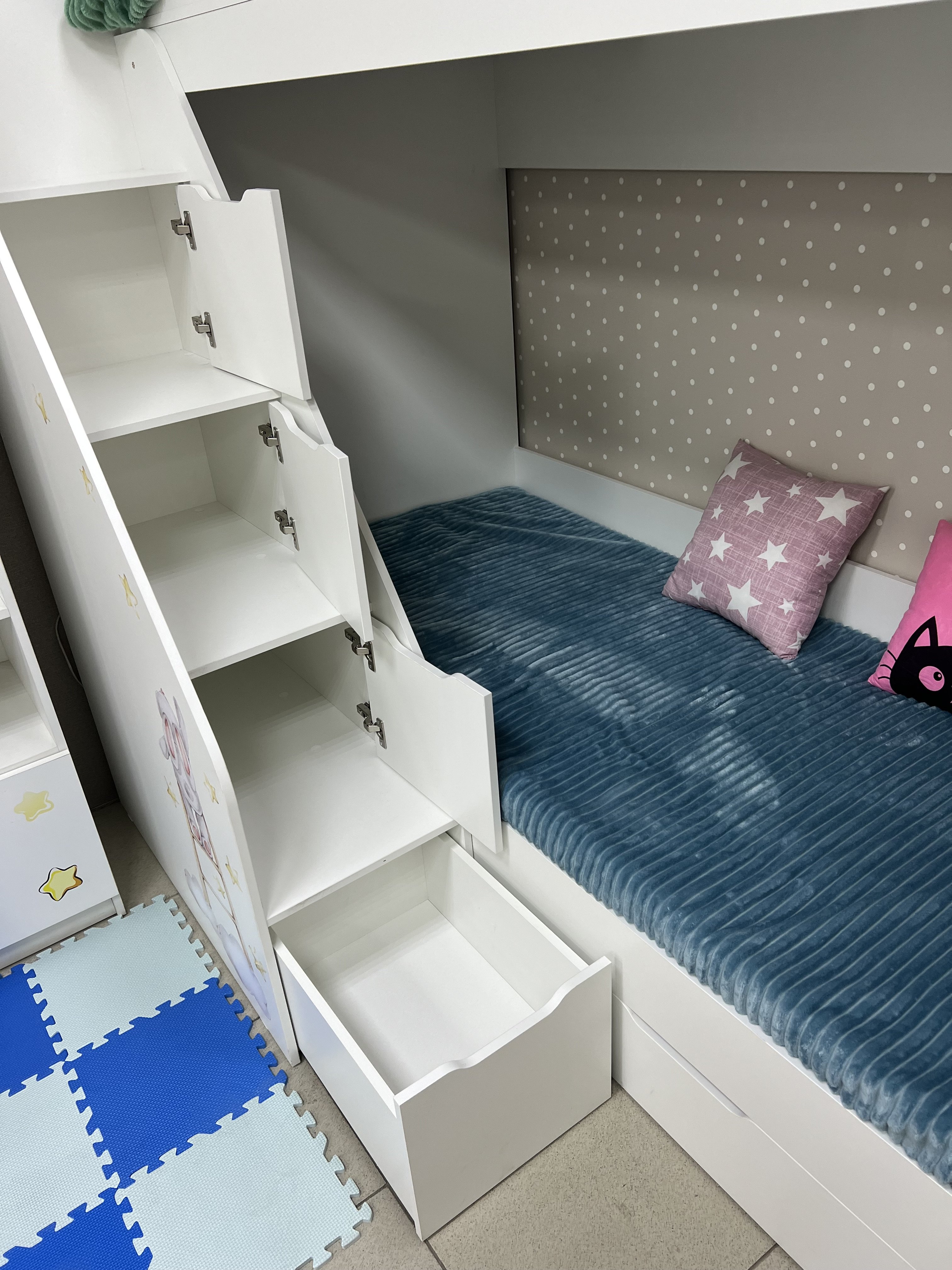 Высокая нагрузка на спальные места. Удобная лестница с ящиками. Высокий, безопасный бортик