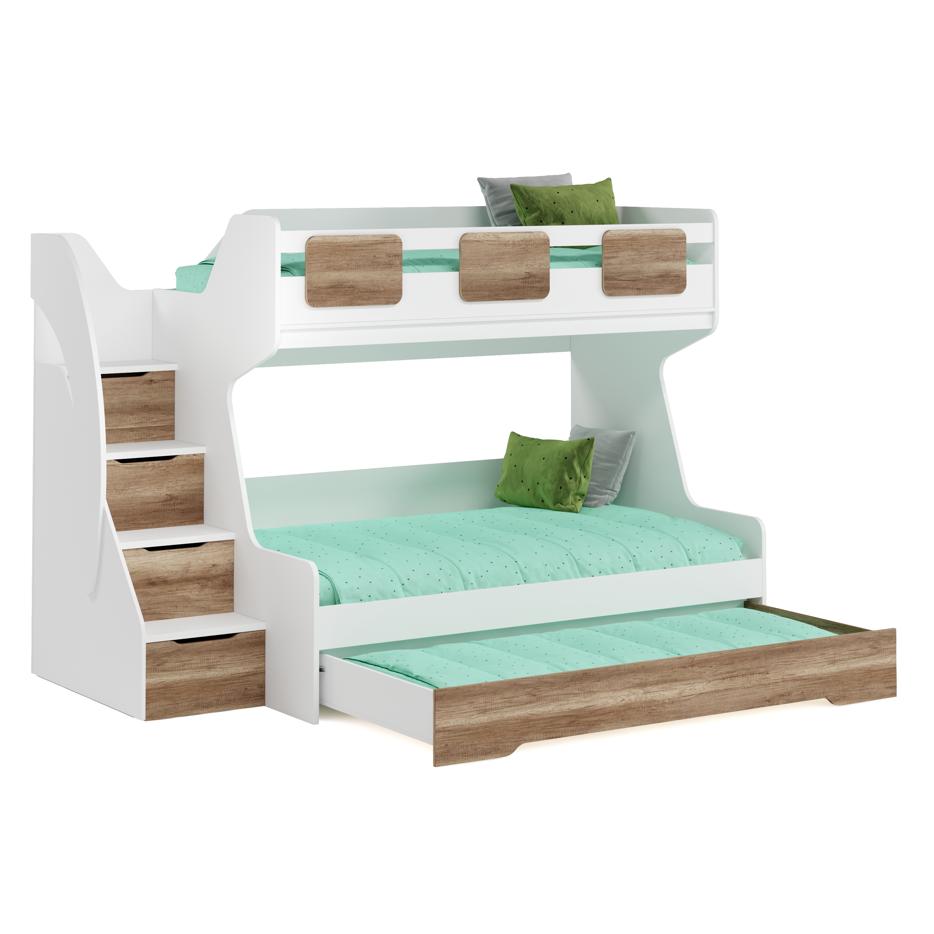 В лестницу встроены выдвижные ящики для игрушек: два нижних ящика на направляющих скрытого монтажа с доводчиками,