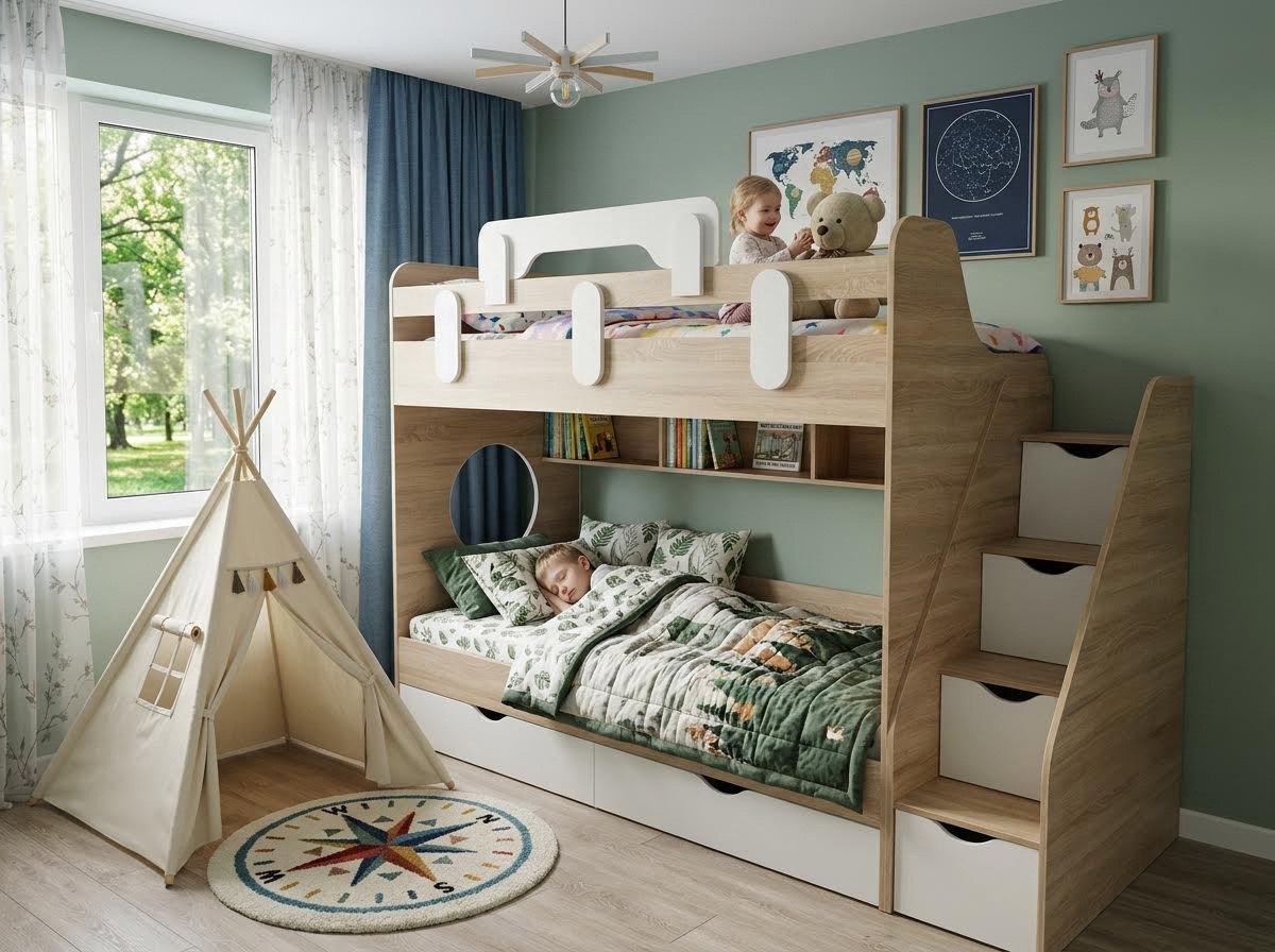 Вместо них - цельный и прочный настил из ЛДСП, который выдерживает сверхвысокую нагрузку и позволяет расположиться даже взрослому с ребенком.