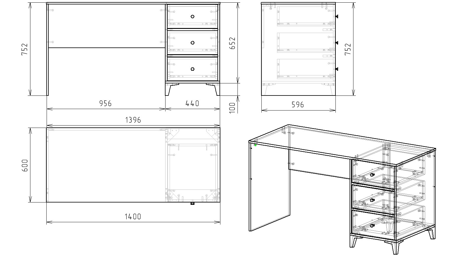 Габариты стола: ширина 1400, глубина 600, высота 752 мм