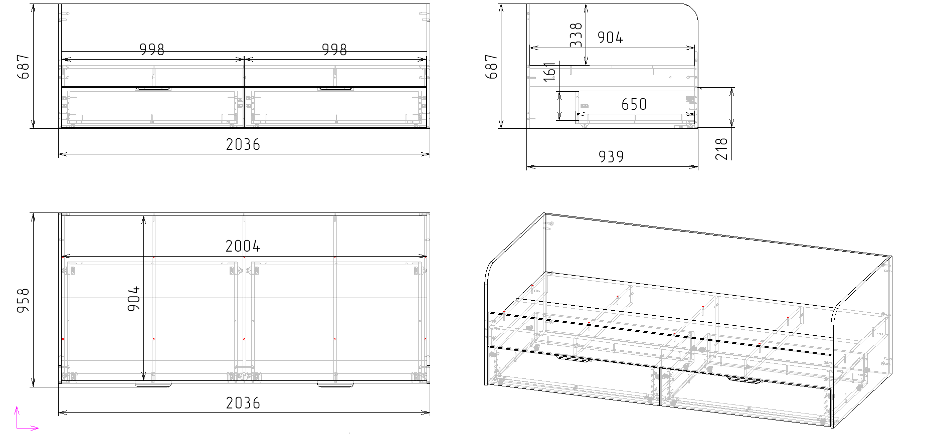 Габариты кровати: ширина 2036 х высота 687 х глубина 939 мм