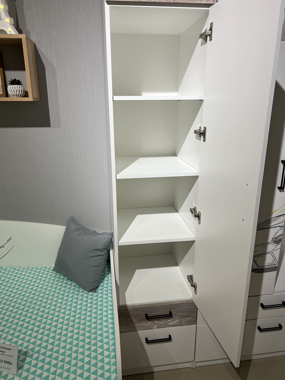 Мебель выполнена из сертифицированного, качественного, экологически чистого ЛДСП Е0,5 в сочетании цветов "бетон пайн" + белый.