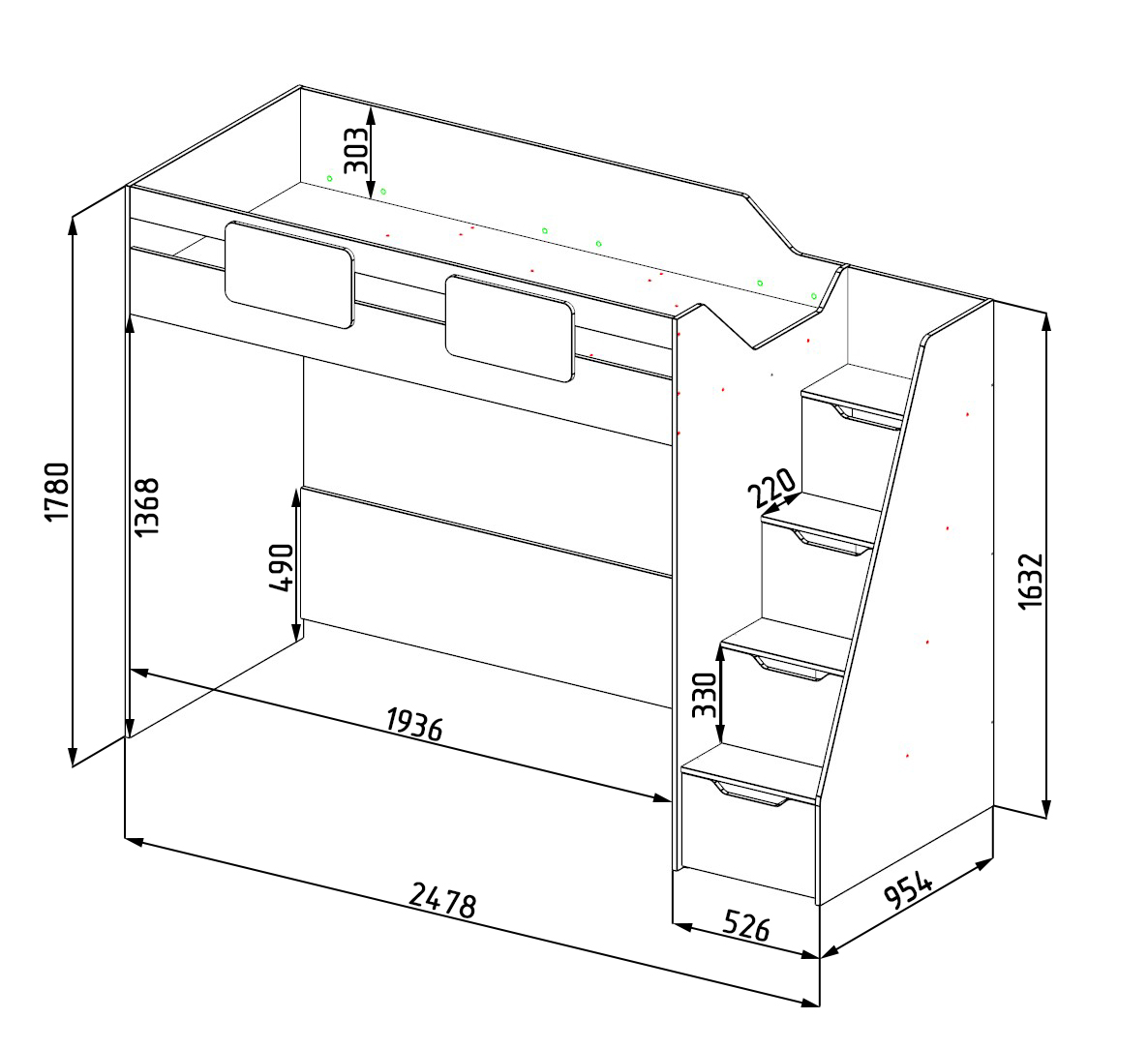 ширина с учетом лестницы 2478, глубина 968, высота 1780 мм