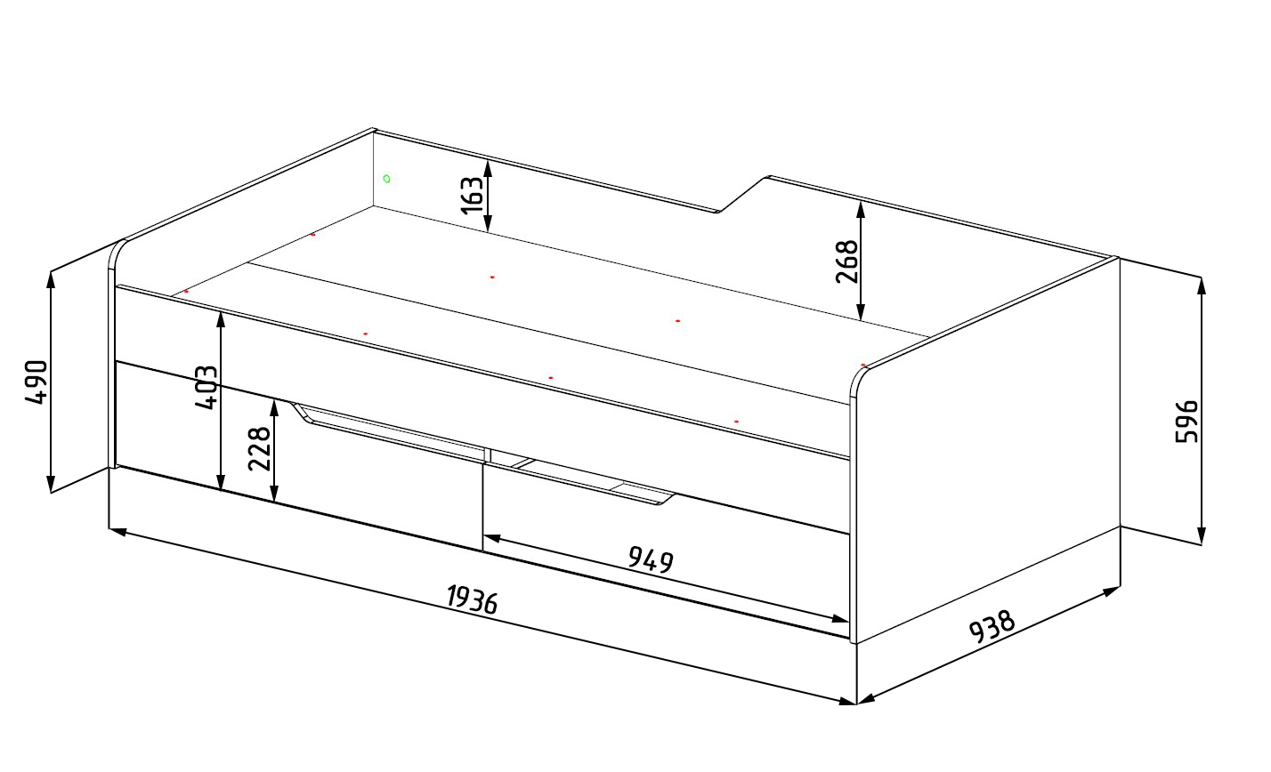 Габариты кровати: ширина 1936, глубина 938, высота 596 мм