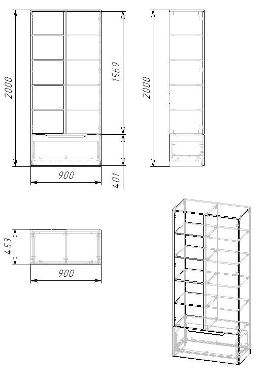 Габариты: ширина 900, высота 2000, глубина 453 мм