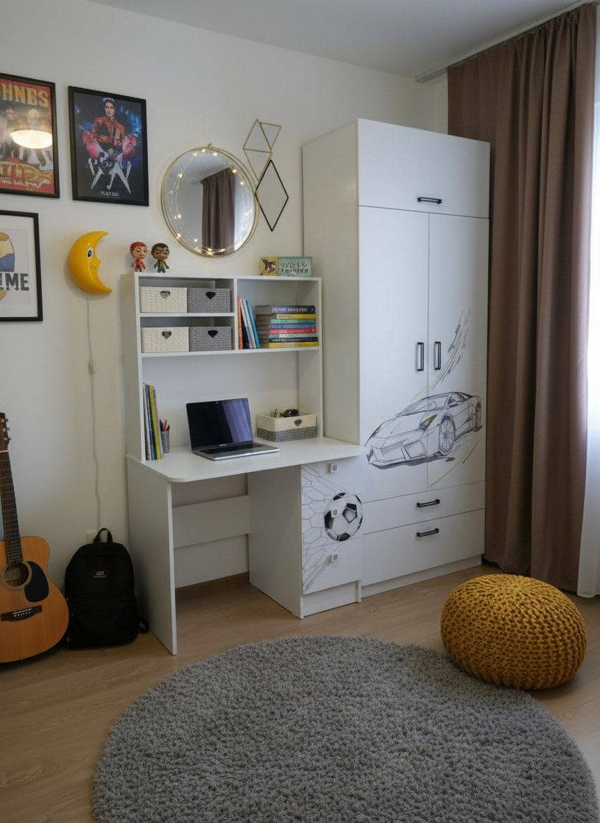 Мебель выполнена из сертифицированного, качественного, экологически чистого ЛДСП класса Е0,5 в белом цвете с дизайнерским принтом.
