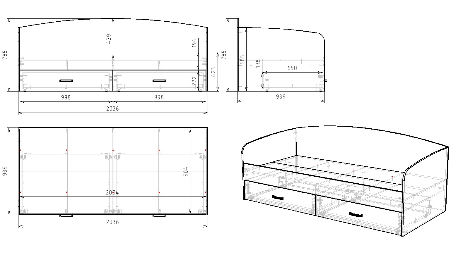Габариты: ширина 2036 х высота 785 х глубина 939 мм
