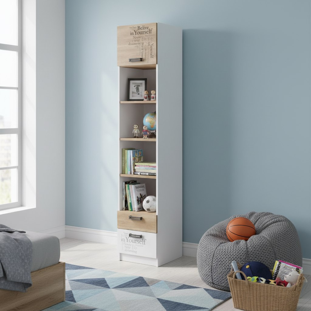 Мебель выполнена из сертифицированного, качественного, экологически чистого ЛДСП Е0,5 в сочетании цветов "дуб каньон + белый" и оформлена принтом.