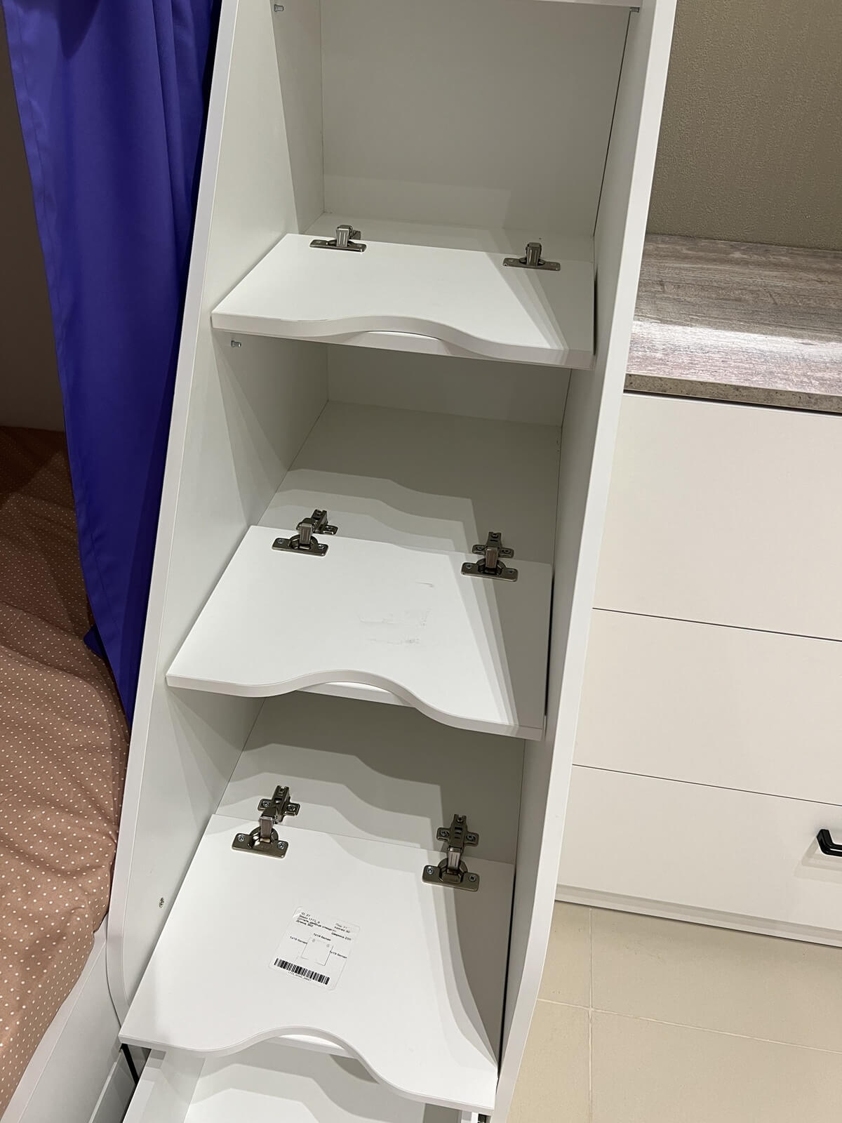 В нижнюю кровать встроен выдвижной ящик для белья и игрушек.