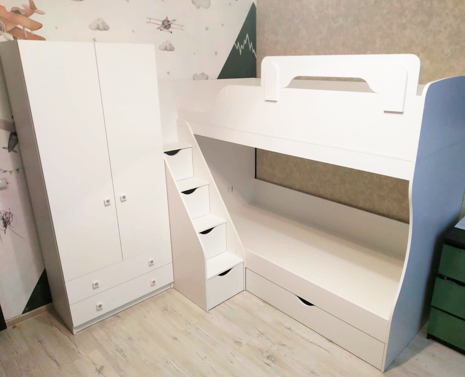 Преимущества данной модели - удобная, безопасная лестница с ящиками для игрушек и комфортная высота кровати.