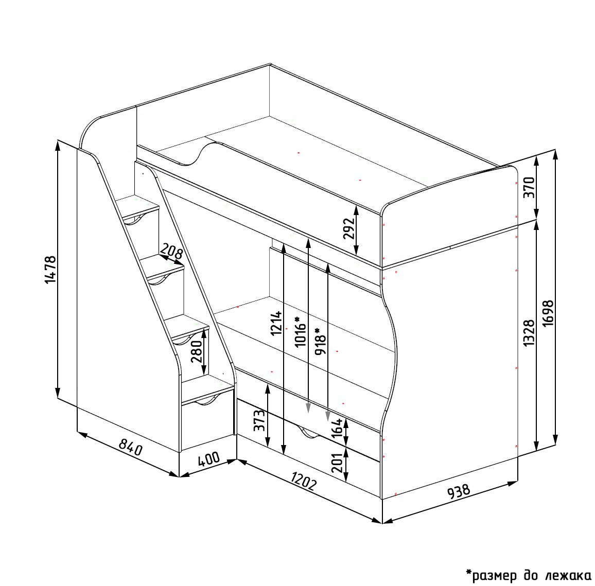 Габариты кровати: ширина 2044, глубина с учетом лестницы 1336, высота 1698 мм