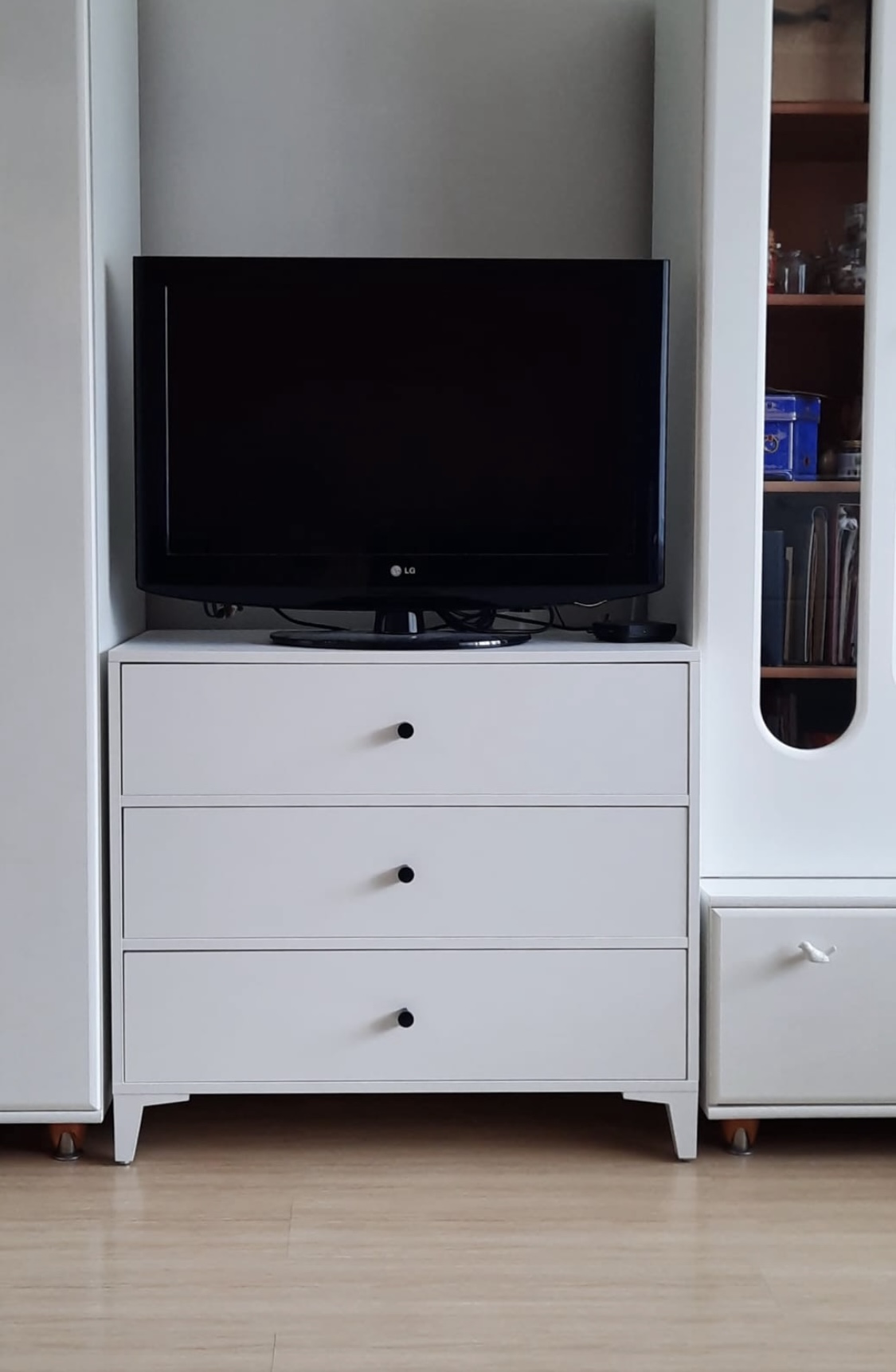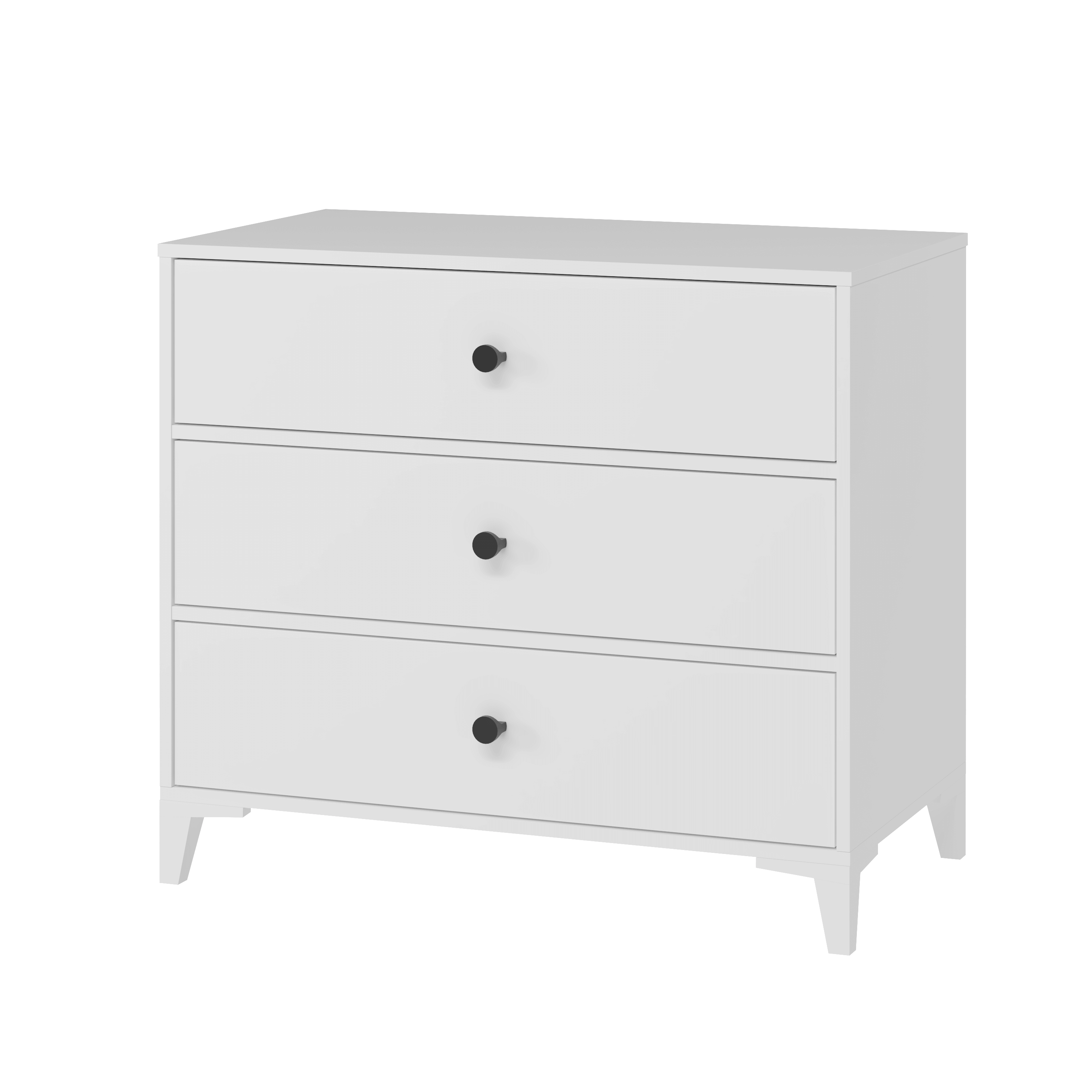 В комод встроены три выдвижных ящика на направляющих скрытого монтажа с доводчиками.
