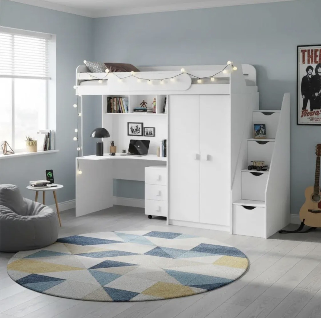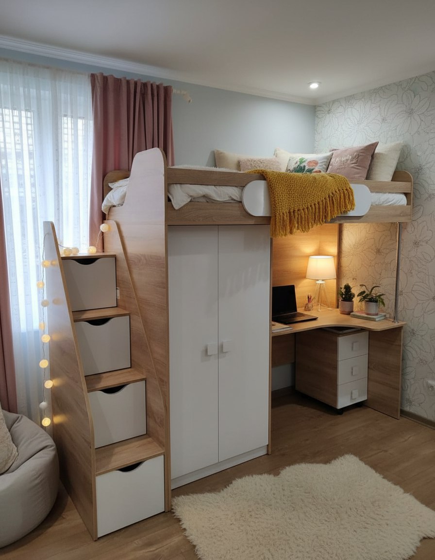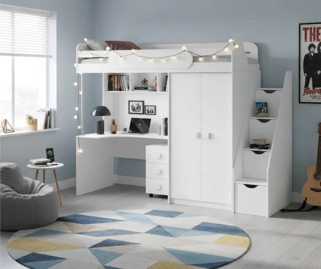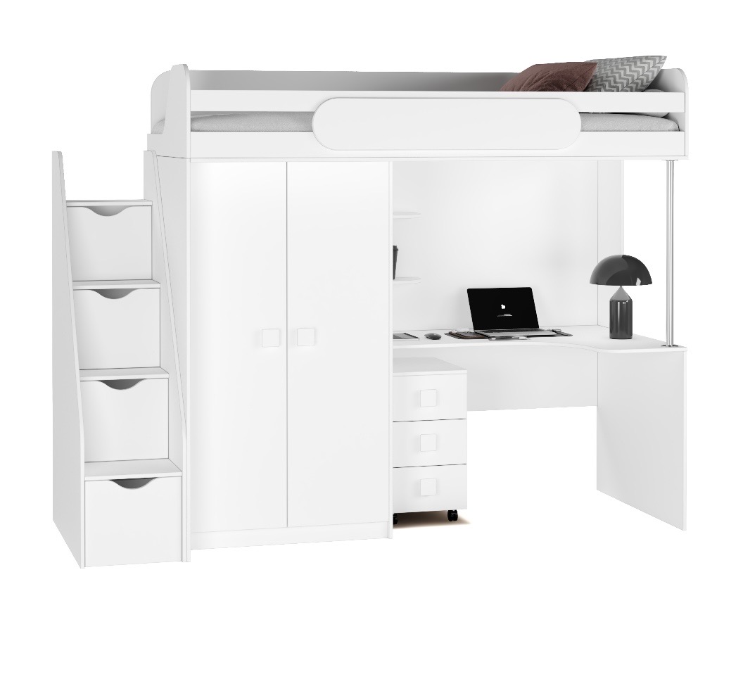 Кровать-чердак с рабочим пространством и шкафом – идеальное решение для детской комнаты.