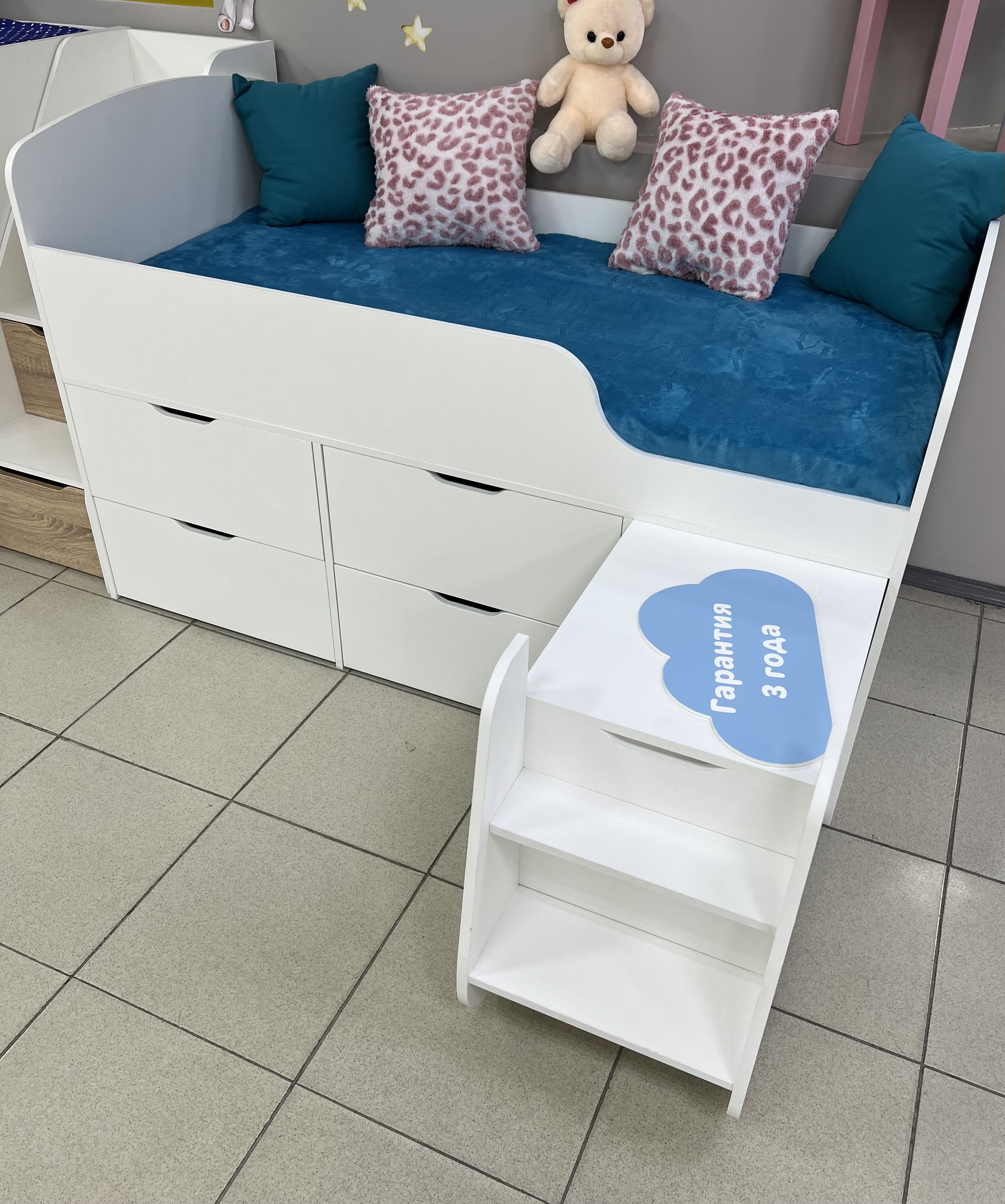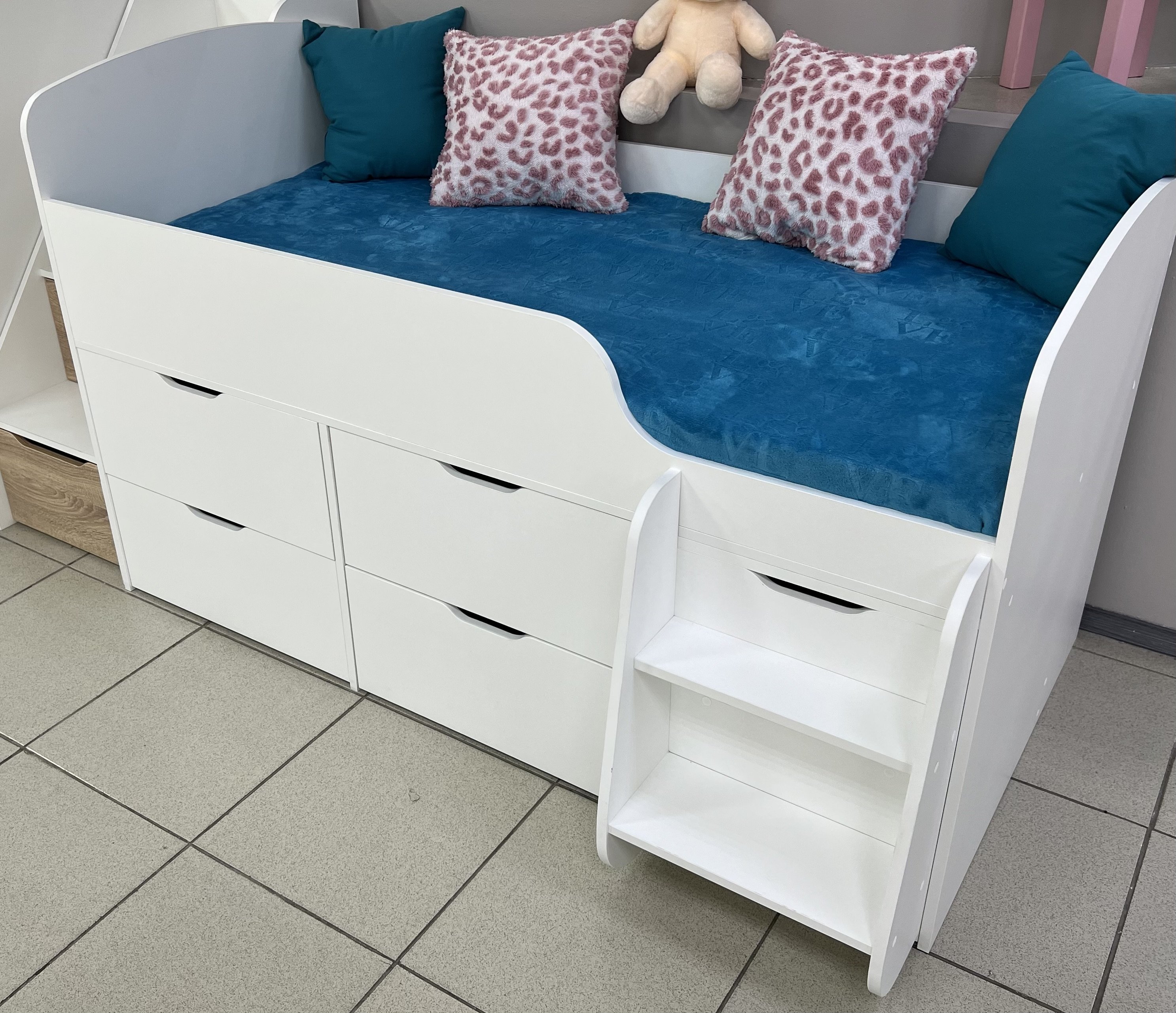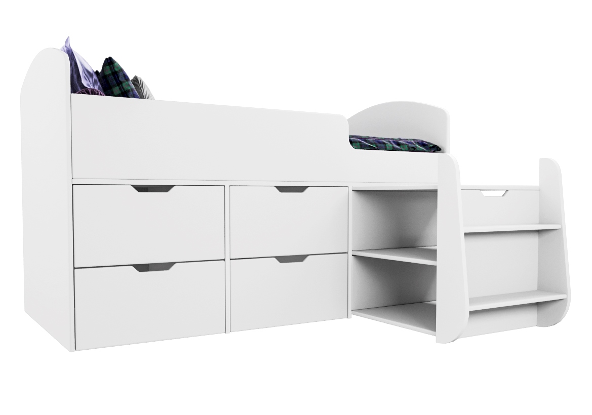 Безопасный, высокий бортик, удобная выдвижная лестница с внутренними полочками и небольшая высота кровати сделаны специально для детей младшего возраста.